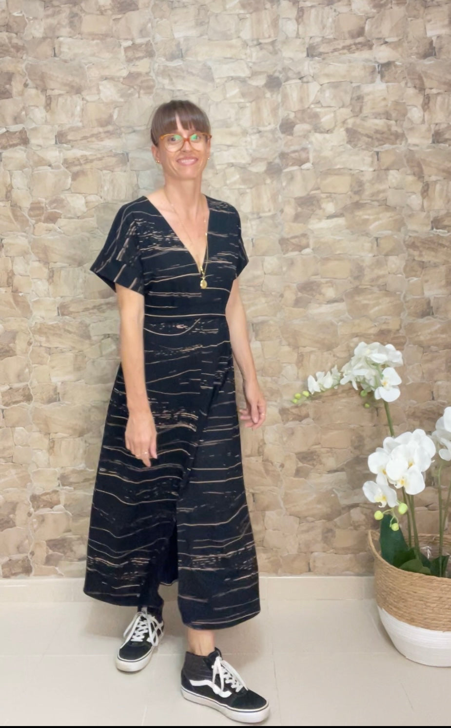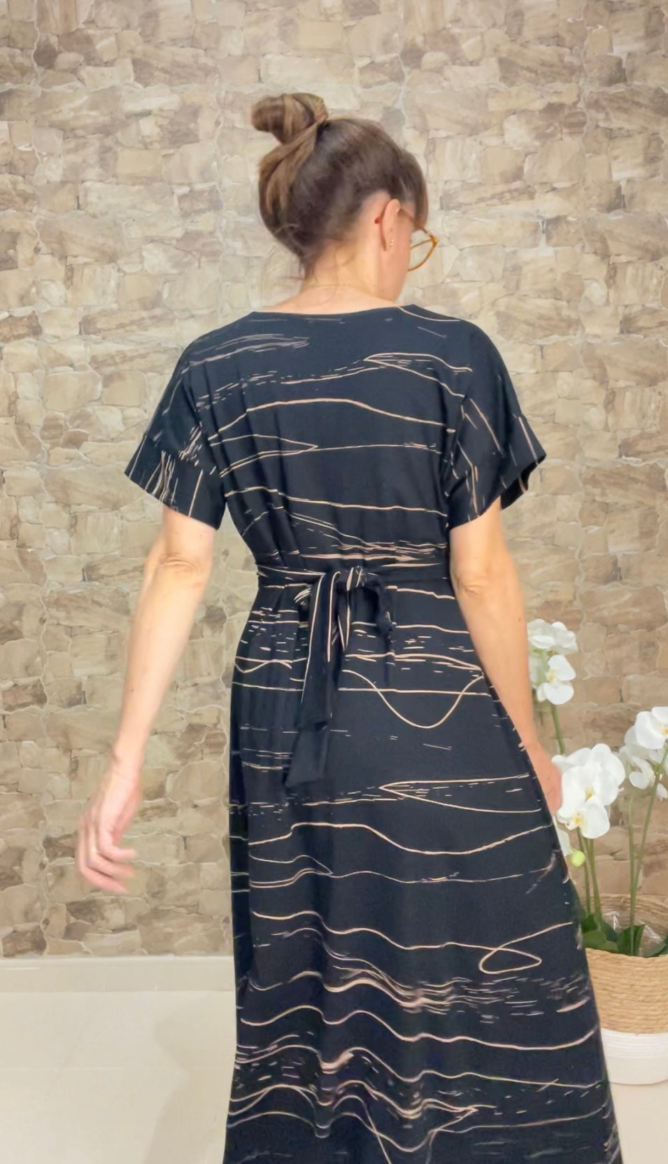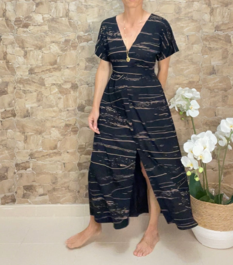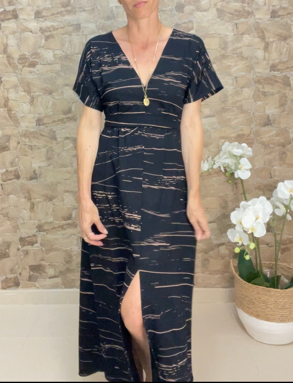 Abito midi con scollo a V e spacco sul davanti che crea un vedo non vedo; in Jersey di viscosa certificata Oeko-Tex, di alta qualità.