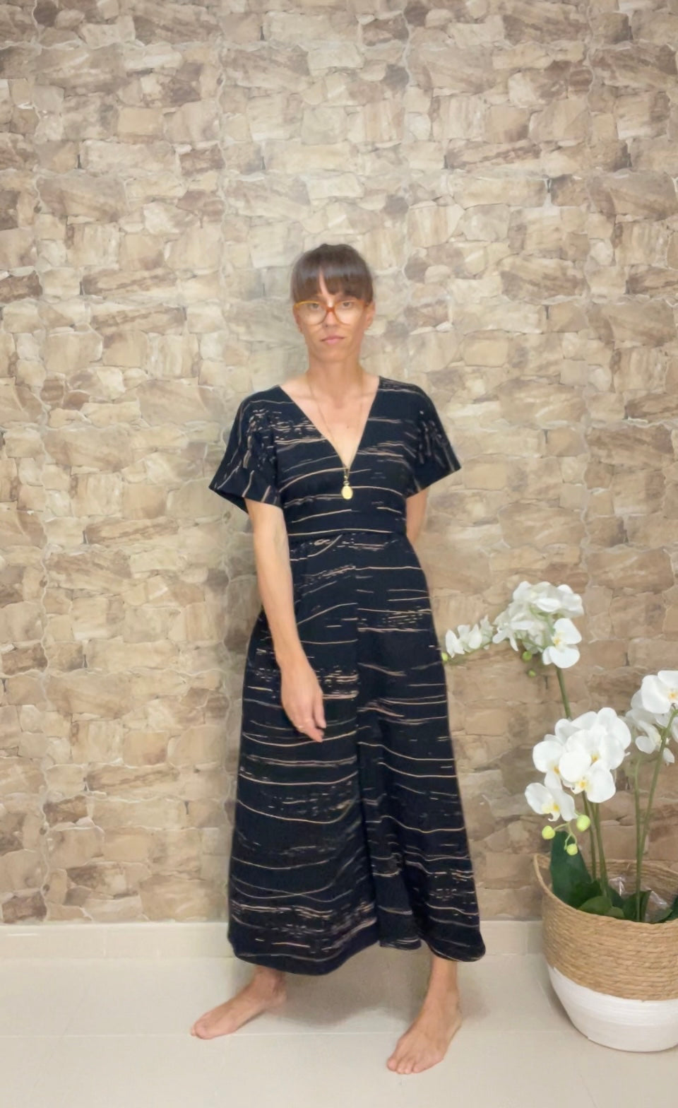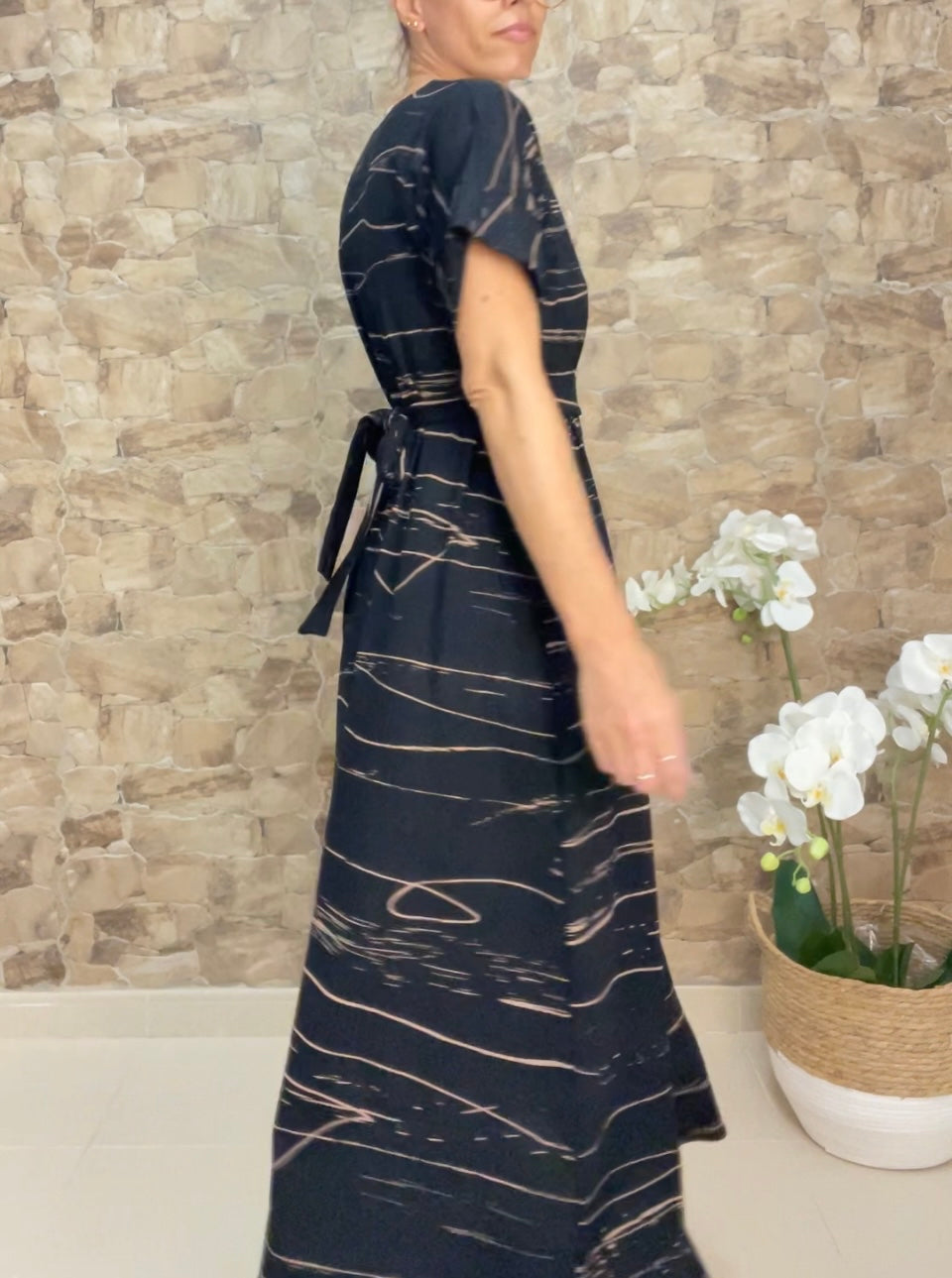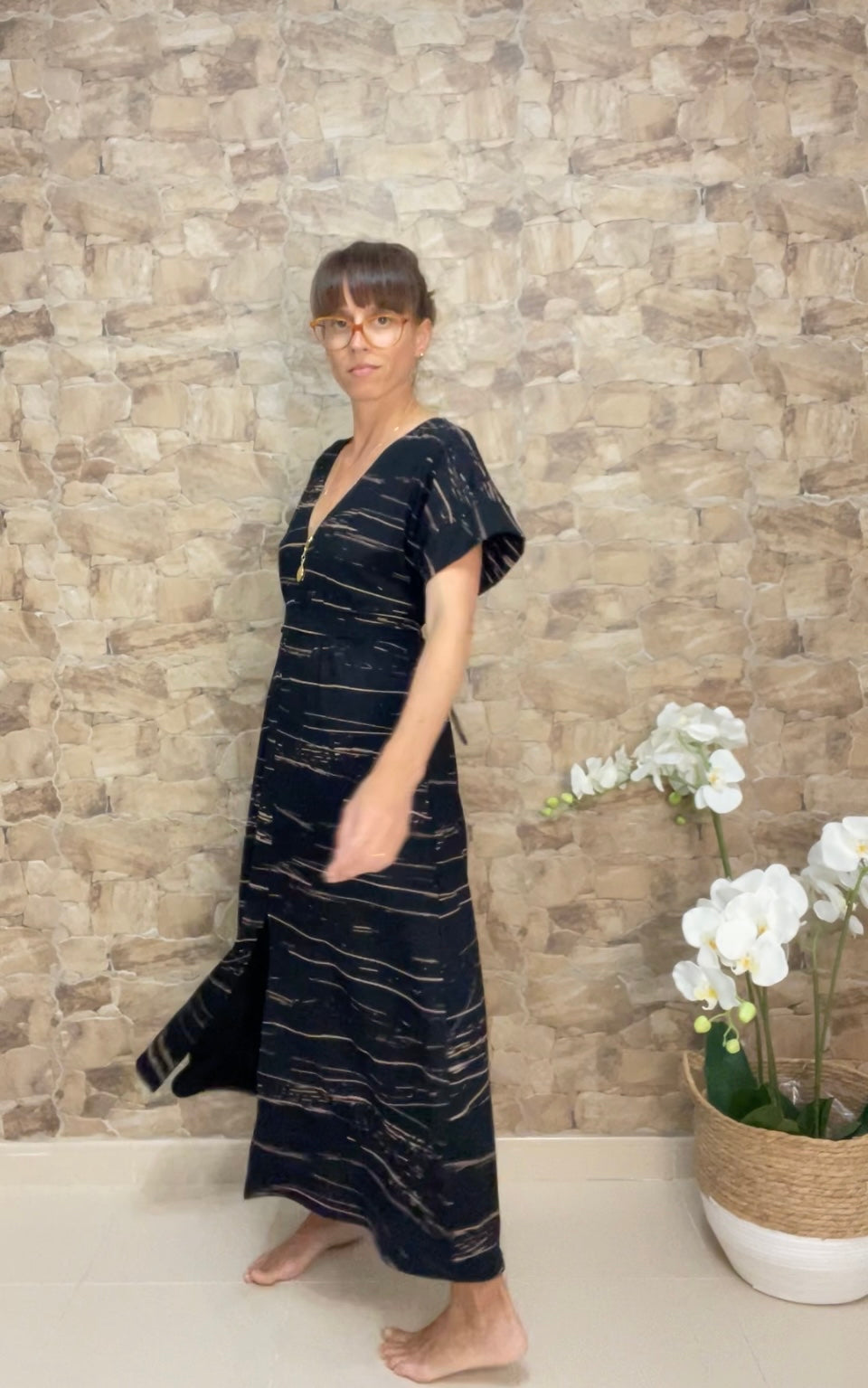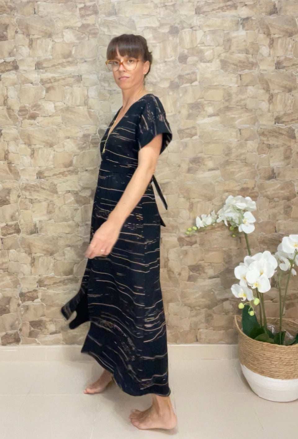 Abito midi con scollo a V e spacco sul davanti che crea un vedo non vedo; in Jersey di viscosa certificata Oeko-Tex, di alta qualità.