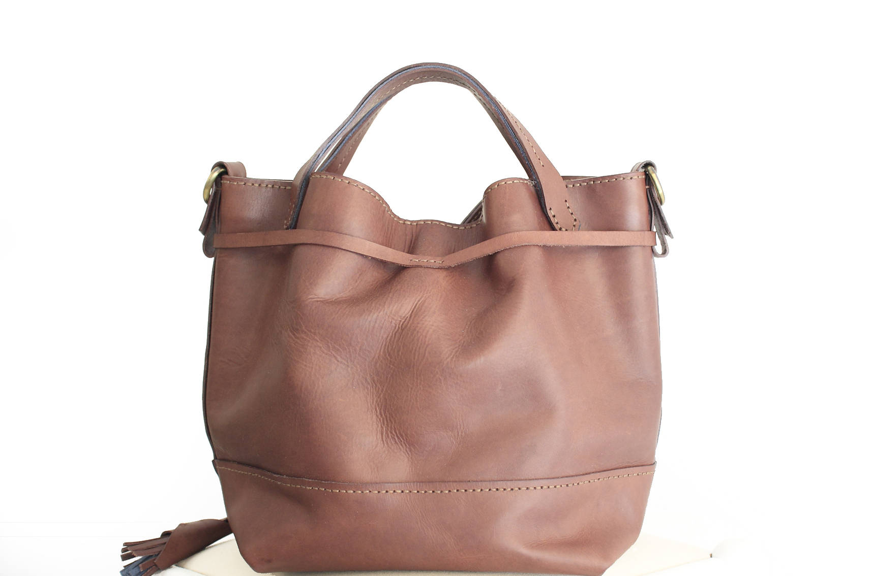 Bucket bag made of luxury italian leather: vegetable tanned and Size oiled (with Sego oil); the bag is completely sewn by hand, with care, while processing your order.